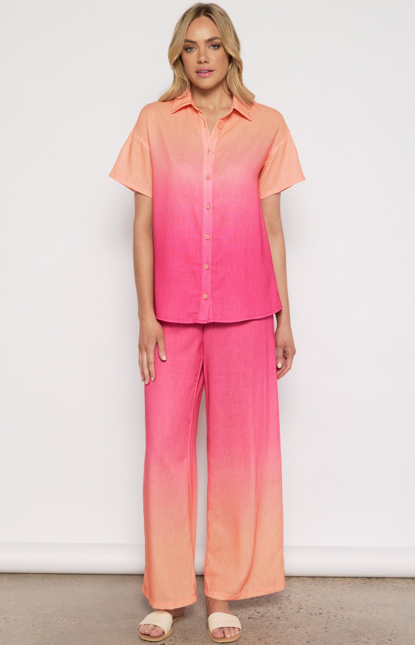 This set is beautiful and a must statement set for this season featuring Faux Linen Ombre Fabrication.Collared Top with Centre Front Buttons.Short sleeves.Elastic waistband (Pants)Wide Leg Design.Spare Button Provided. No Lining. Model is wearing a size 8. Model's height is 177cm.