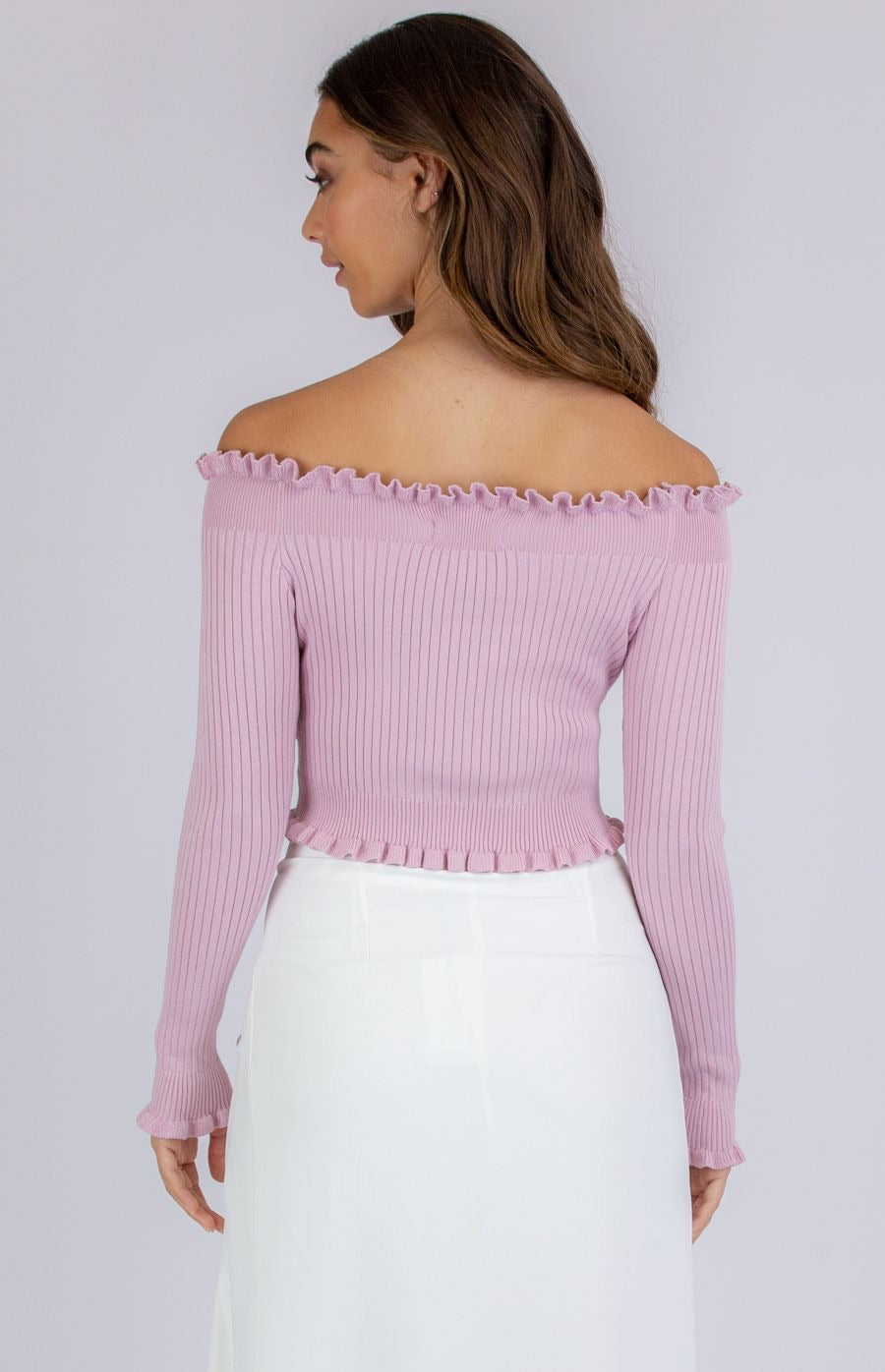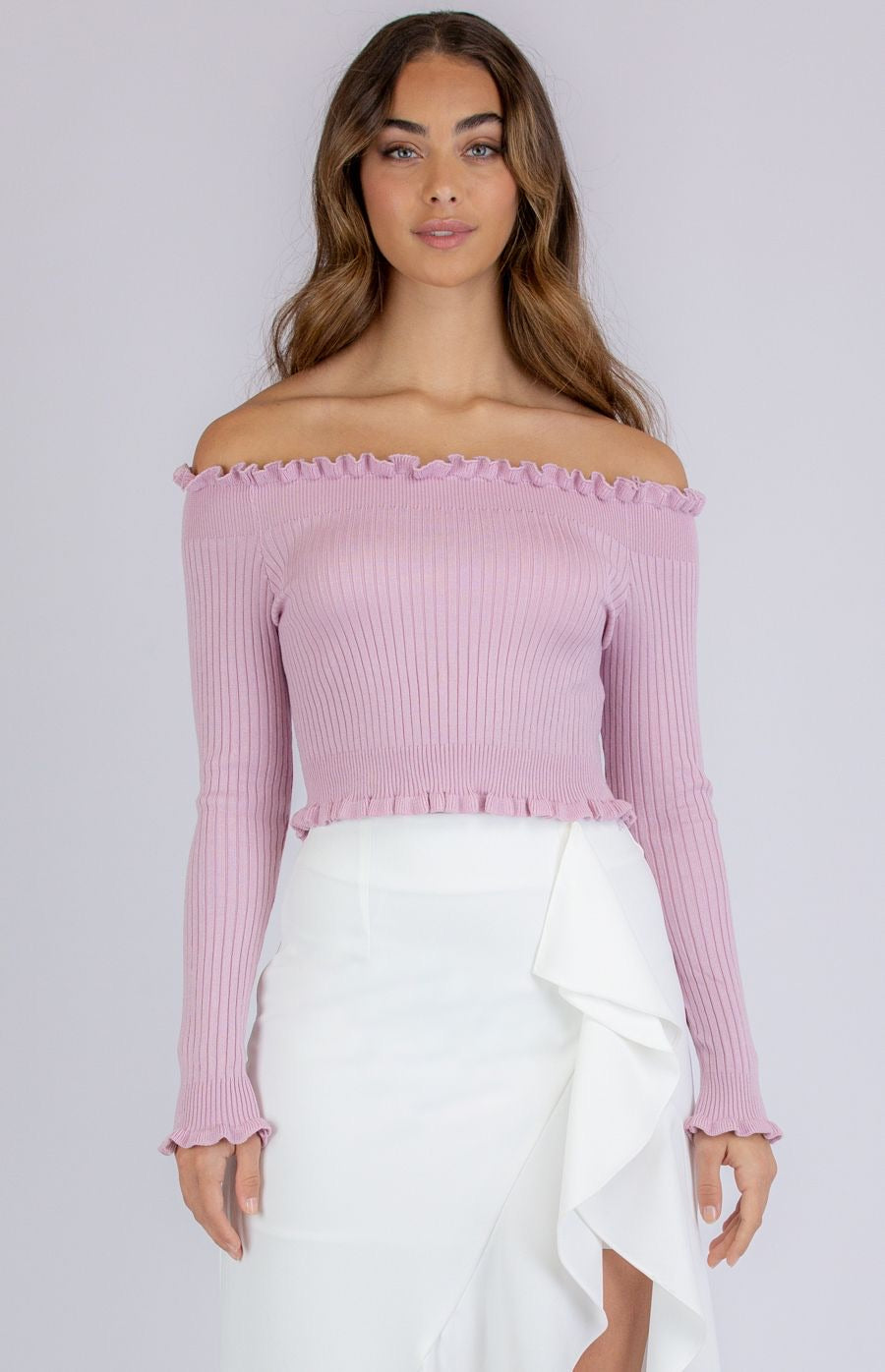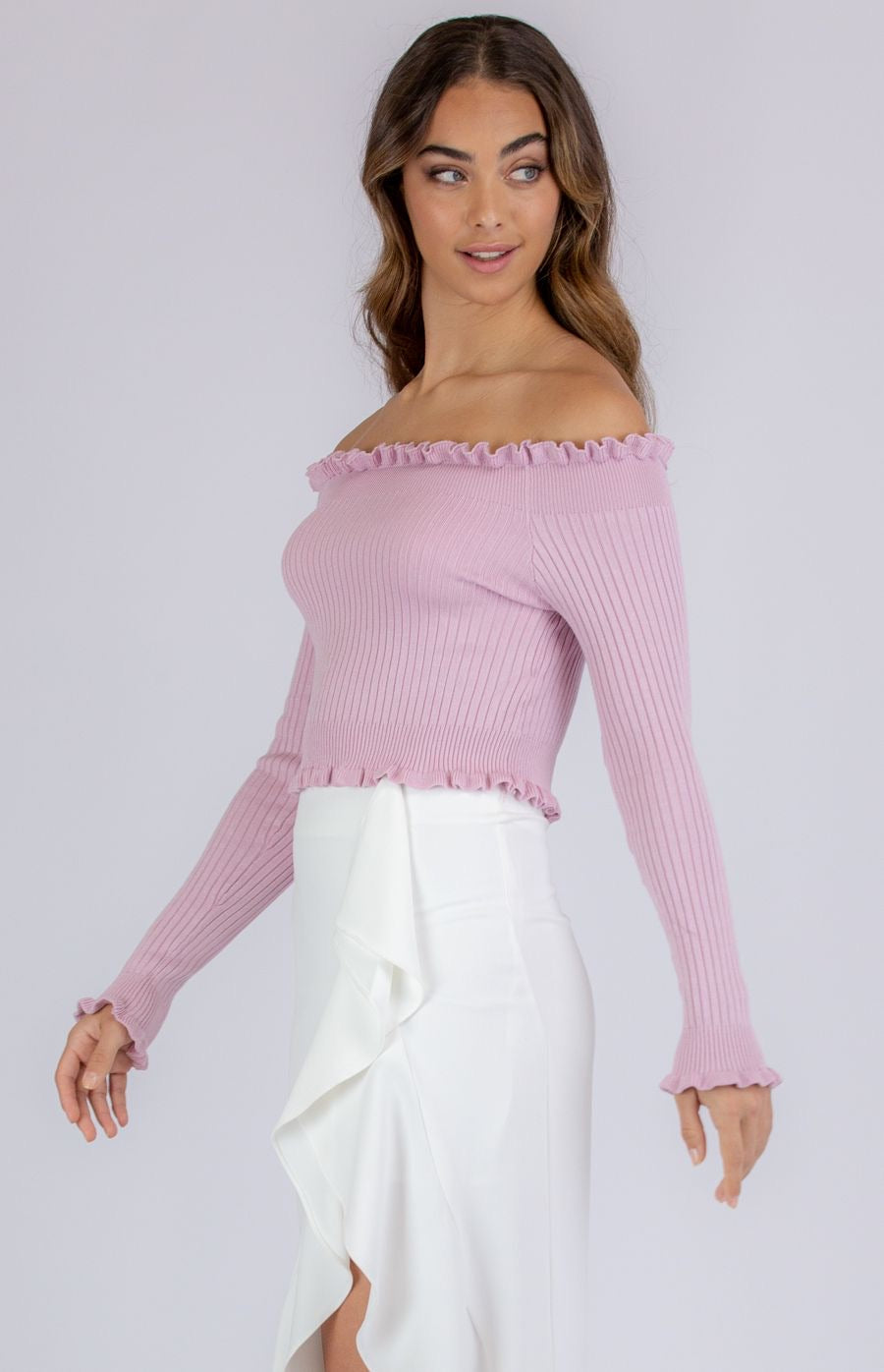 This knit off the shoulder crop is such a chic piece with its Rib knit fabrication. Off the shoulder style. Lettuce edge hem details. Cropped length. Slight stretch soft