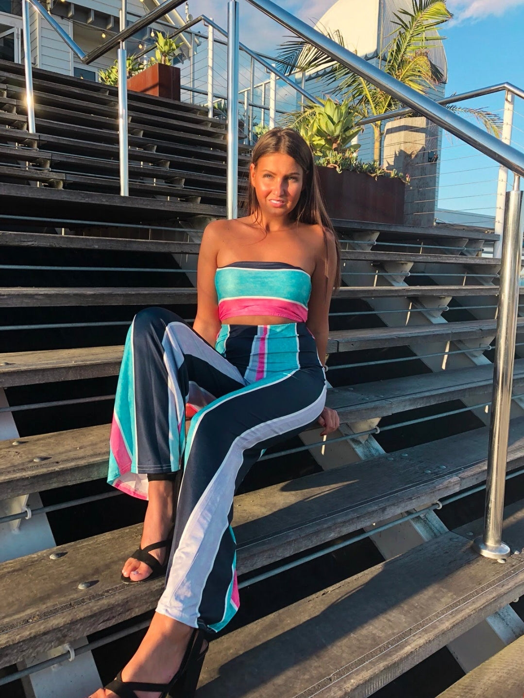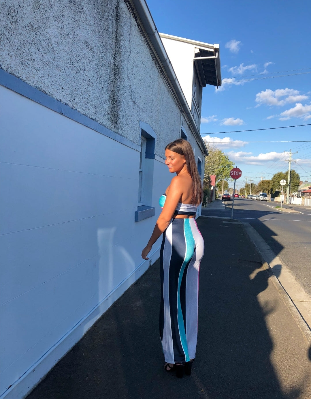 This beautiful set is all statement with its stripe top and High Waisted Pant Set is the perfect statement piece for any stylish woman. The striped pink and blues give the set a playful yet sophisticated feel, while the high waisted design flatters all body types. With a lightweight fabric, this set is comfortable and easy to wear, giving you the power to take on anything in style.