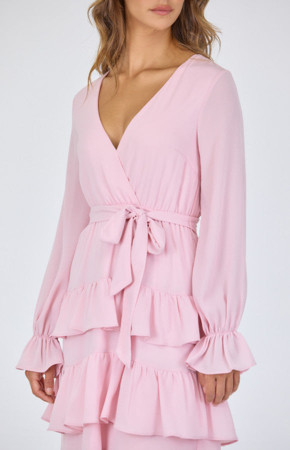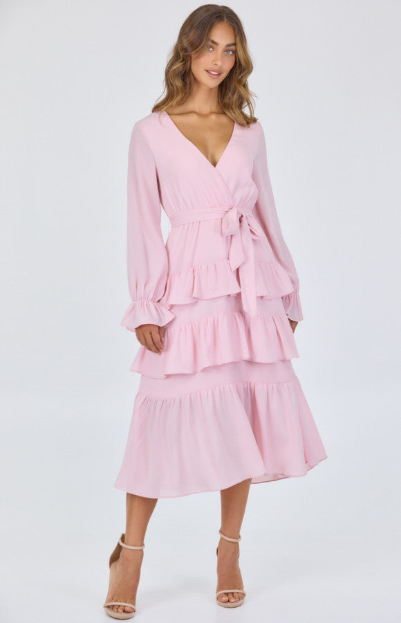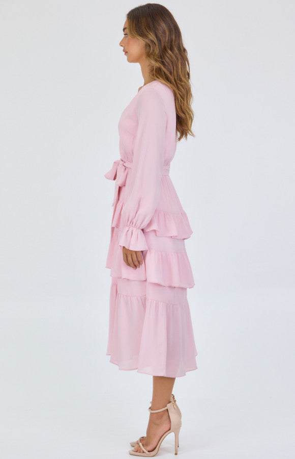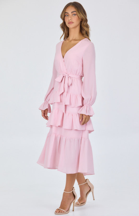 This pink dress is so beautiful perfect for your special occasion with its Textured chiffon fabrication. V neckline with stay stitch. Elastic detail at cuff and waist. Removable waist tie. Long sleeve design.Tiered hem design. Fitted at the waist. Lined. Midi length. Model is 173cm tall and is wearing a size 6
