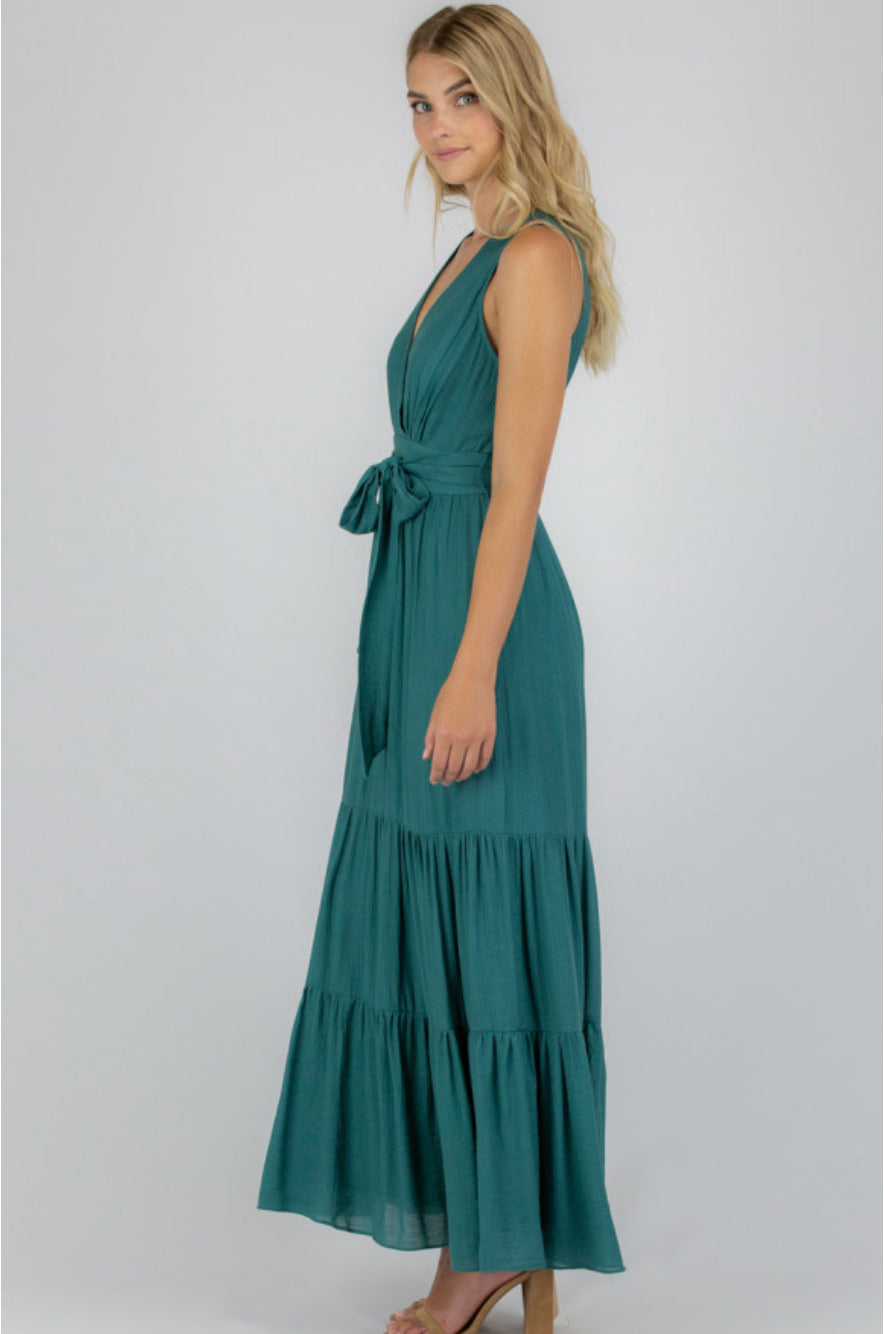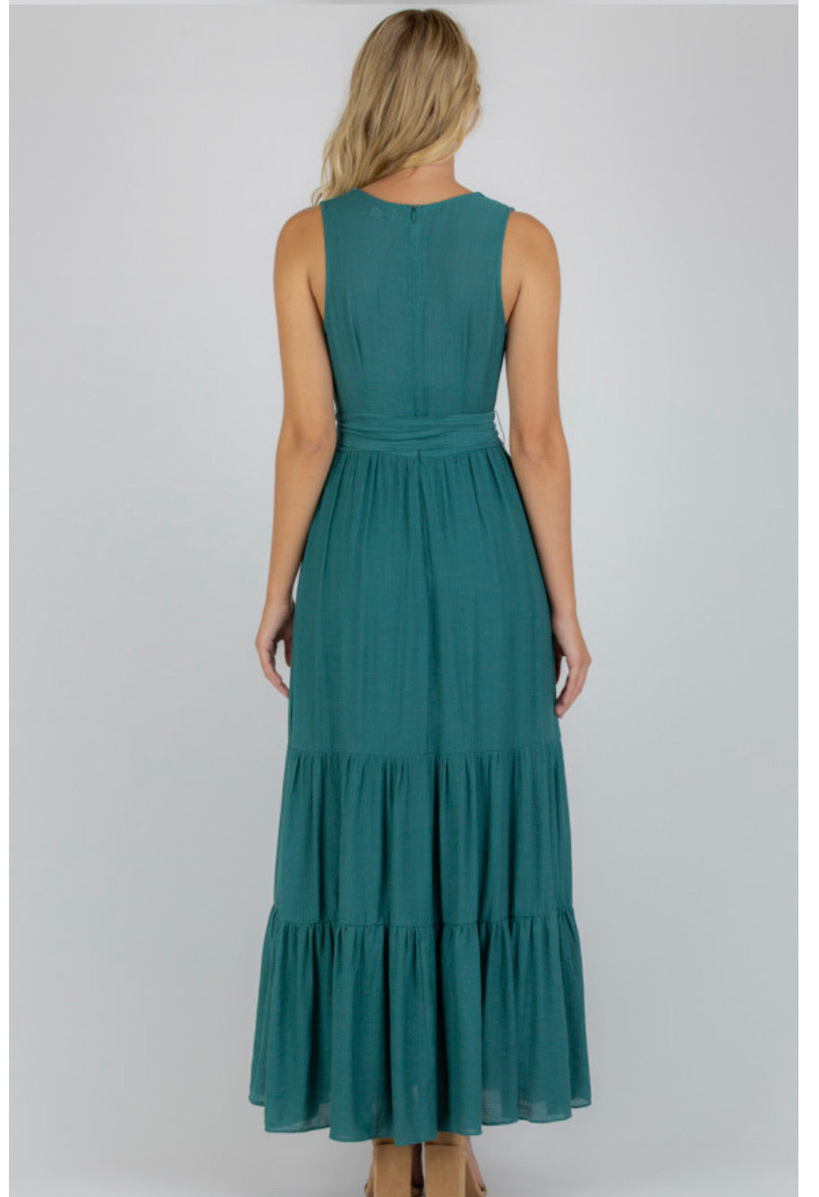This teal maxi dress is absolutely beautiful with Lightweighted control textured non-stretch fabri. Wrap V neckline desig. Centre back invisible zip. Self fabric waist tie. Tiered maxi skirt. Fully lined. Model is 170cm tall and is wearing a size