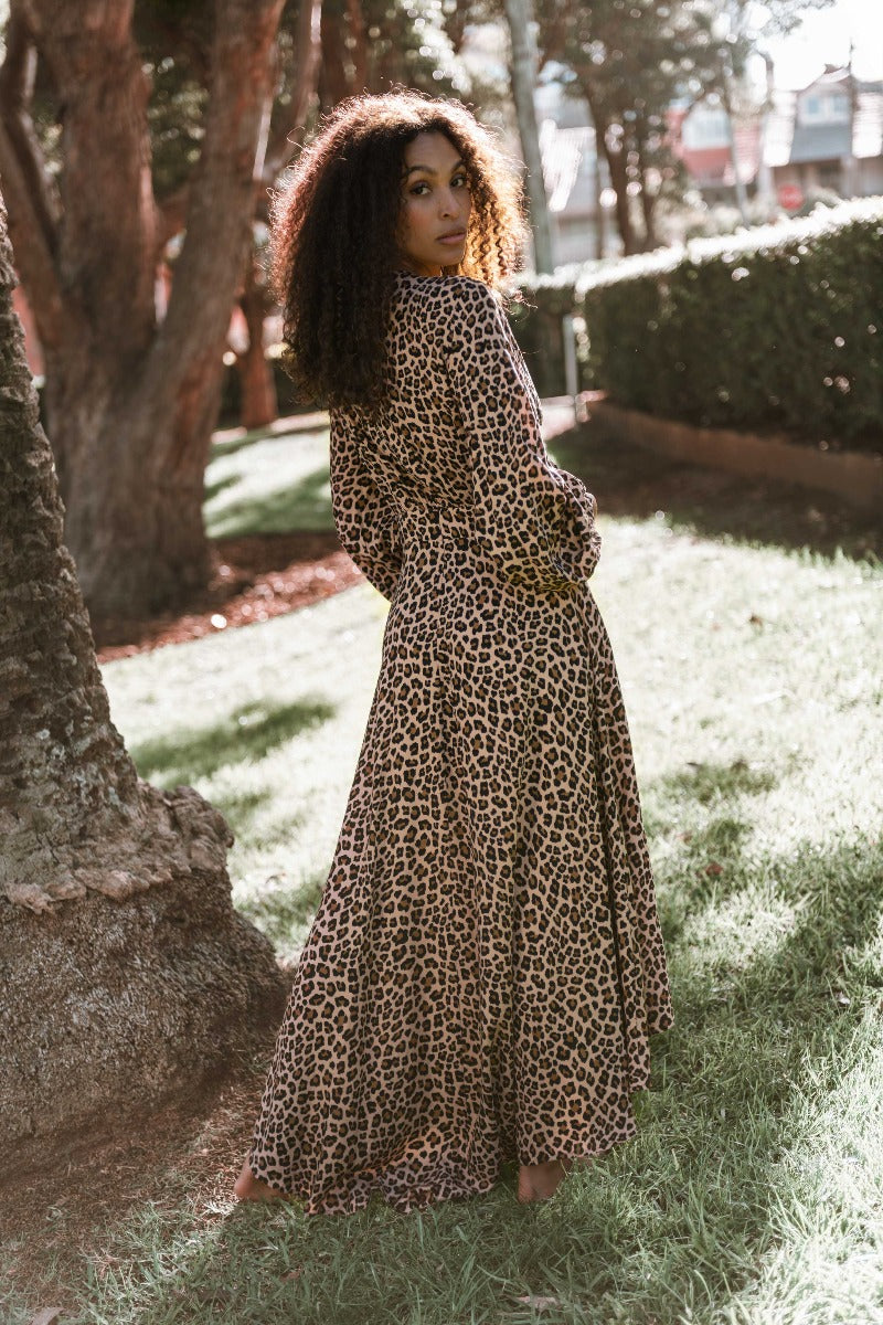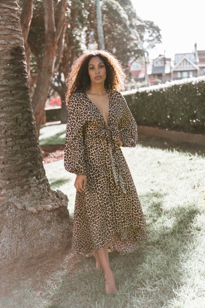 This dress is so beautiful with its leopard print design featuring unlined, tie details on bust, style multiple waysethically made with love. Fabrication: 100% Silky Rayon