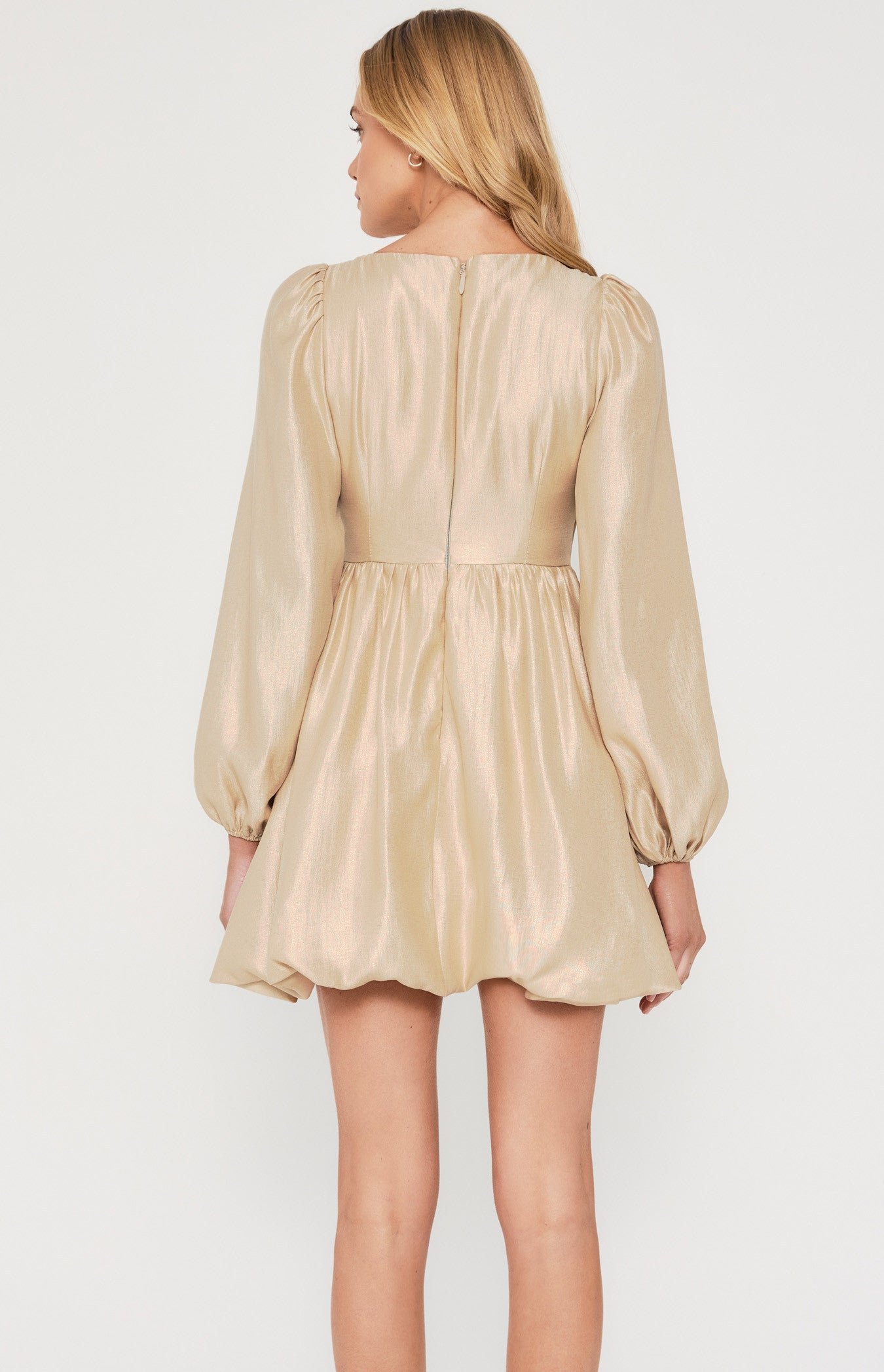 Sparkle and shine in our Shimmer Bubble Dress! Made with a sheen metallic fabric, it features a sweetheart neckline, front bodice drape detail, and gathering at the shoulders for a flattering fit. Long elastic bubble sleeves and a bubble hem add playful touches. Fully lined for comfort great for day to night