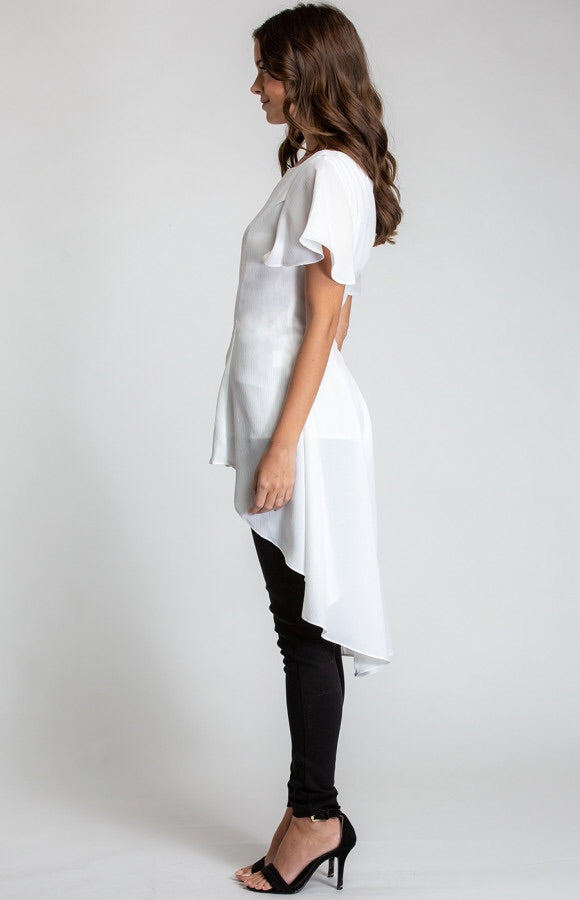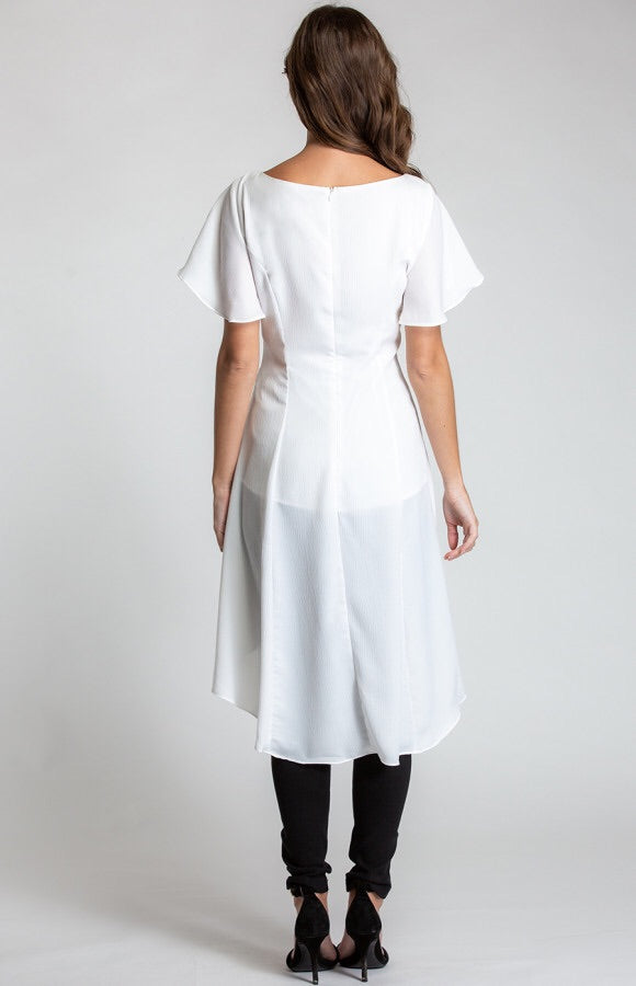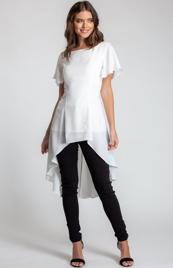 Textured fabric, Flare short sleeves, Loose fit top Fully lined. Asymmetric hem. Great with skinny jeans and wetlook pants