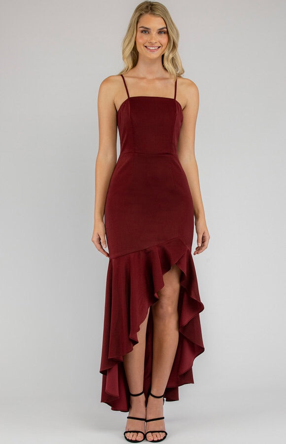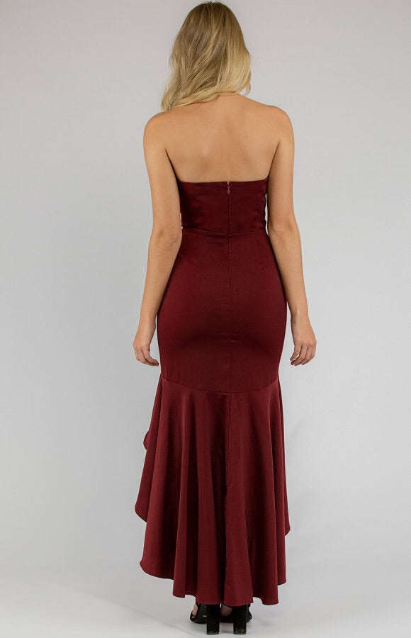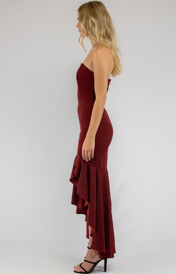 - With the option of wearing this dress strap or strapless, the outfit combinations and possibilities are endless. This strapless midi dress with asymmetrical hemline and ruffle hem is perfect for more formal occasions. Boning structure in bodice. Centre back invisible zip. Hook & eye closure. Removable adjustable strapsBoning Structure for bust shaping. Asymmetrical hem with ruffle detail. Bodice lined. Midi length. model is 168cm tall and is wearing a size 6.